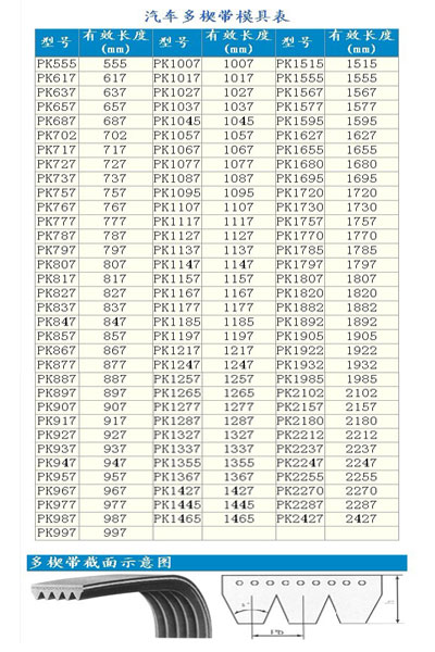 橡膠多楔帶兼 有v帶和平帶二者的優(yōu)點(diǎn),既有平帶的柔軟、強(qiáng)韌的特點(diǎn),又有v帶緊湊、高效等優(yōu)點(diǎn)。它的主要特點(diǎn)如下:1.傳動(dòng)功率大,空間相同時(shí)比普通V帶的傳動(dòng)功率的高30%。 2.傳動(dòng)系統(tǒng)結(jié)構(gòu)緊湊,在相同的傳動(dòng)功率情況下,傳遞裝置所占空間比普通V帶小25%。 3.帶體薄,富有柔軟性,適應(yīng)帶輪直徑小的傳動(dòng),也適應(yīng)高速傳動(dòng),帶速可達(dá)40m/s;振動(dòng)小,發(fā)熱少,運(yùn)轉(zhuǎn)平穩(wěn)。 ![]() 我公司主產(chǎn)的汽車(chē)多楔帶按照使用材料主要分為氯丁橡膠多楔帶和三元乙丙橡膠多楔帶。 |